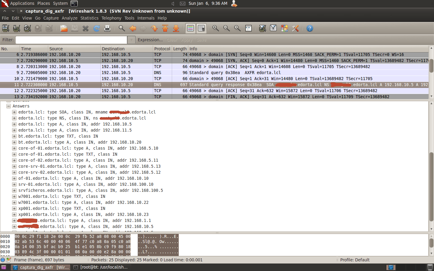 ¡Tranferencia realizada! A continuación os dejo la captura en la que se puede apreciar el “Three Way Handshake” de TCP desde Backtrack hacia el servidor, paquetes 6 al 8. Una vez establecida la conexión el PC realiza la consulta para la transferencia de zona, paquete 9. Y finalmente la respuesta del servidor, paquete 11, y que corresponde con la información que sale en la ventana de abajo y donde se pueden ver listados todos los equipos.