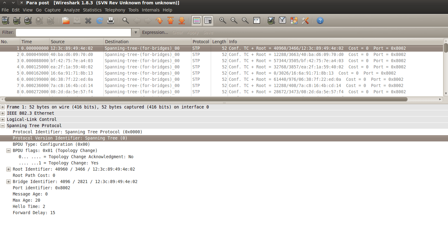 Si analizamos con Wireshark el tráfico vemos como las BPDUs indican un cambio de topología, “Topology Change = 1”. También podemos ver que la dirección MAC es distinta en todos los casos, eso es porque Yersinia manda las distintas Tramas con MAC de origen aleatoria.